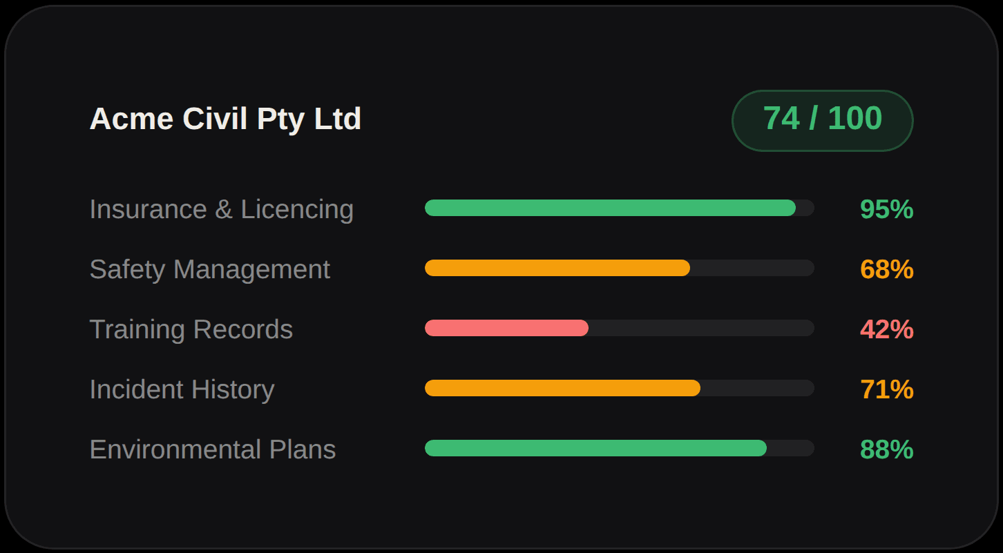 Screens contractors for QHSE compliance across every relevant category - from insurance to training records - and generates structured corrective plans for any gaps.