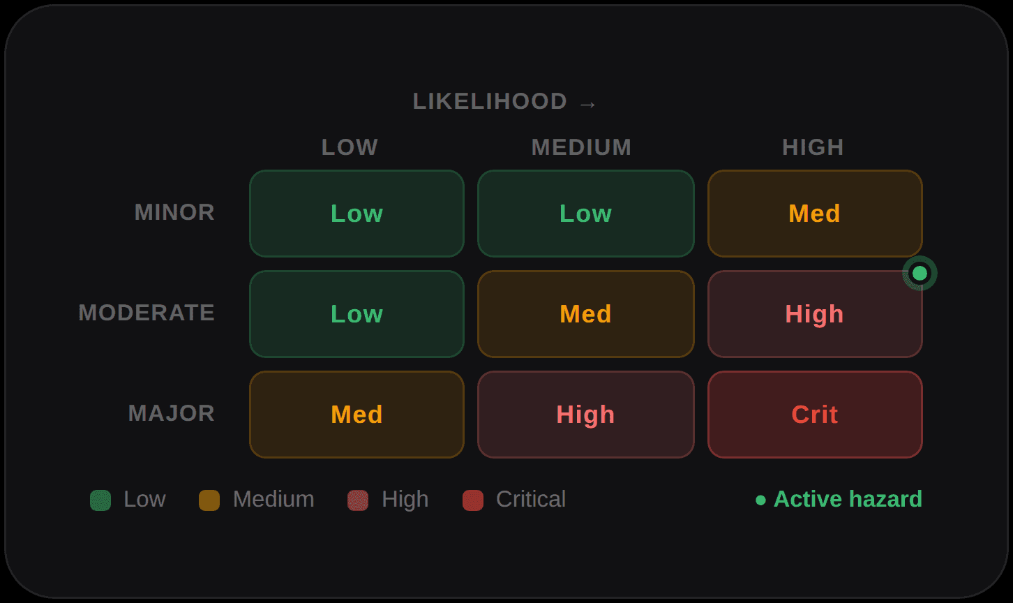 Performs and reviews HIRA, JSA, RAMS, SWMS etc. with likelihood × consequence scoring, control hierarchy, and action plans.