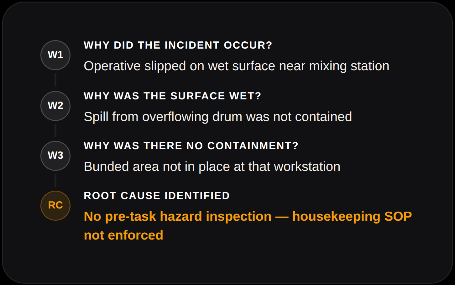Guides investigations using fishbone, root-cause, and 5-Why analysis to help you find the systemic failures beneath every incident.